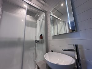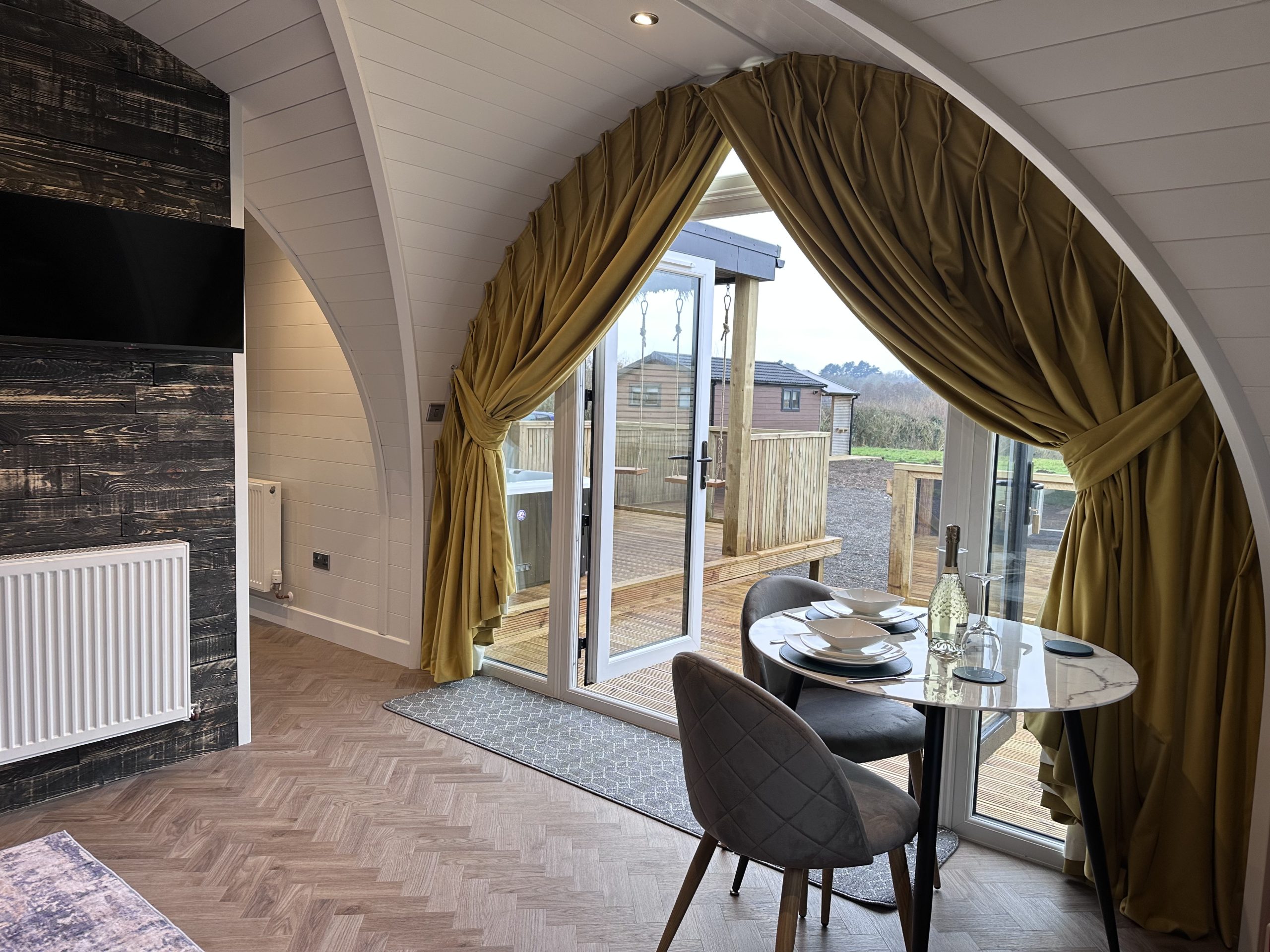 Heated lodge, modern kitchen with oven, electric hob, integrated fridge, dishwasher as well as a toaster, kettle & microwave, Wi-Fi and smart TV. One bedroom with double bed from which you can relax whilst watching the smart TV, dressing table.