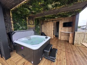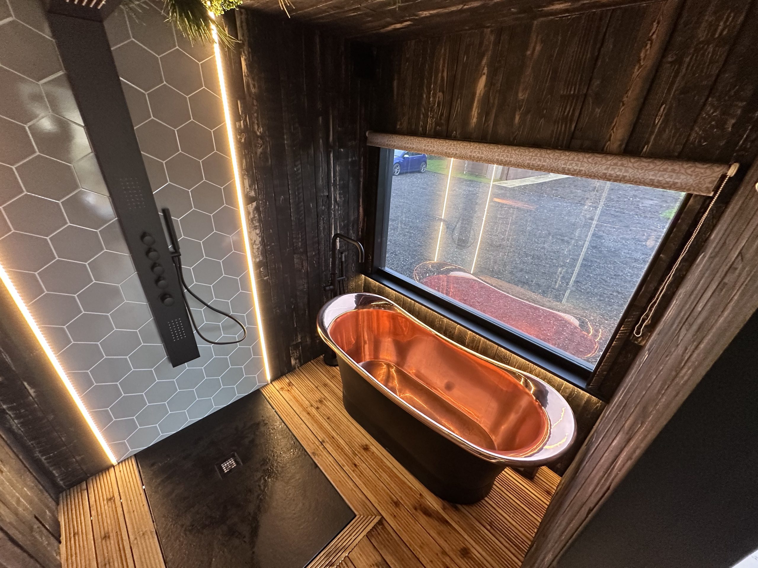 OUTDOOR AREA: Decking/Seating area, Swings, Hot Tub, Shower, Roll top copper bath tub, Sauna